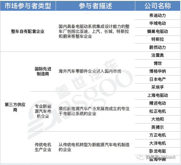 目前新能源汽車電機市場有三類供應商,一類是整車企業(yè)自供電機產(chǎn)品,如比亞迪、北汽新能源等;一類是傳統(tǒng)電機制造商向新能源汽車電機市場轉(zhuǎn)型,如大洋電機、方正電機等;一類是新興專業(yè)新能源汽車電機制造商,如上海電驅(qū)動、上海大郡,北京精進等。
