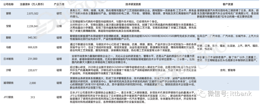 硅鋼即新能源汽車驅(qū)動電機需用到高牌號的無取向電工鋼,具備相關資質(zhì)的國內(nèi)外企業(yè)相對較少,國外代表企業(yè)有日本制鐵、浦項鋼鐵、JFE鋼鐵等,國內(nèi)代表企業(yè)包括首鋼、寶鋼等