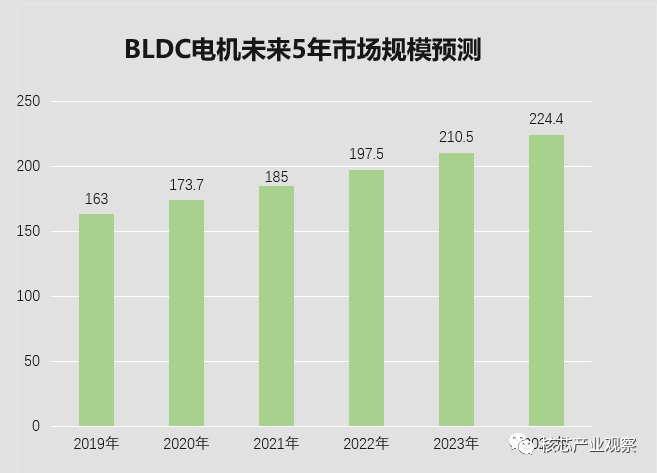 預(yù)計(jì)未來幾年BLDC電機(jī)的年復(fù)合增長(zhǎng)率將會(huì)是6.5%左右。據(jù)統(tǒng)計(jì),2019年BLDC的市場(chǎng)規(guī)模約為163億美元,預(yù)計(jì)到2024年將會(huì)達(dá)到224.4億美元左右。