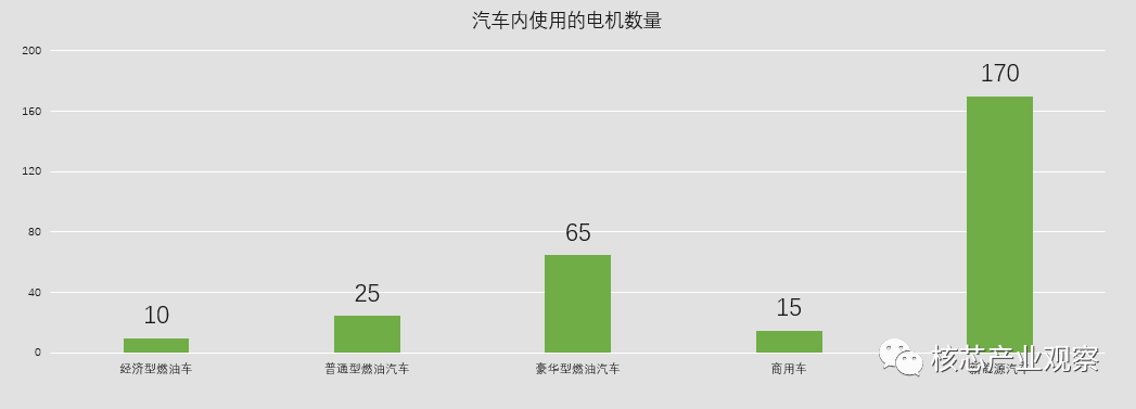 一般來說,經(jīng)濟(jì)型燃油車會(huì)配備10個(gè)左右的電機(jī),普通的汽車會(huì)配備20到30臺(tái)電機(jī),而豪華型汽車則會(huì)配備60到70臺(tái),甚至上百臺(tái)電機(jī),而新能源汽車一般需要130到200臺(tái)電機(jī)。