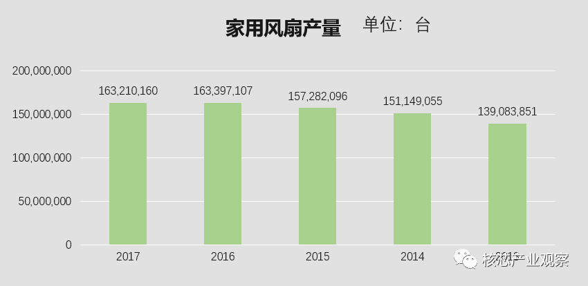 從家用風(fēng)扇來看,這一塊是非常大的市場(chǎng),中國(guó)家用風(fēng)扇的產(chǎn)量是非常大的,根據(jù)國(guó)家統(tǒng)計(jì)局的數(shù)據(jù),2018年,我國(guó)家用風(fēng)扇的產(chǎn)量是1.8億臺(tái),2017年沒有12月的數(shù)據(jù),但11個(gè)月的數(shù)據(jù)是1.6億臺(tái),2016年是1.6億臺(tái),估計(jì)2019年有1.9億臺(tái)左右。
