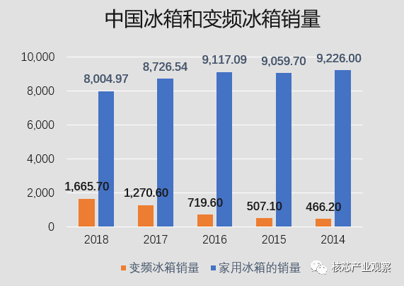 圖7:中國(guó)冰箱和變頻冰箱銷量情況。(數(shù)據(jù)來源:國(guó)家統(tǒng)計(jì)局)