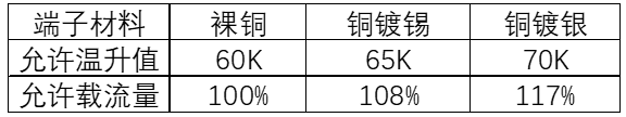 ? ? ? ? ?在福州大學張冠生教授的《電器學》和GB/T25840-2010 規(guī)定電氣設備部件(特別是接線端子)允許溫升的導則等材料中,關于導體載流量與溫升的關系是:溫升與電流的p次方成正比。p值取決于導體的表面散熱系數(shù),通常在1.5到2之間,一般取平均值1.76。溫升允許值越高,說明導體允許流過的電流越大?;谏鲜隼碚摚覀儗⑾嗤?guī)格的裸銅、銅鍍錫、銅鍍銀端子的載流能力對比如下表。? ? ? ? ?通過對比會發(fā)現(xiàn)銅鍍銀后其“允許通過的電流”相對于裸銅增加了近20%,所以在不改變導體規(guī)格的前提下,僅僅通過改變鍍層,就可以獲得“允許載流能力”的提升。