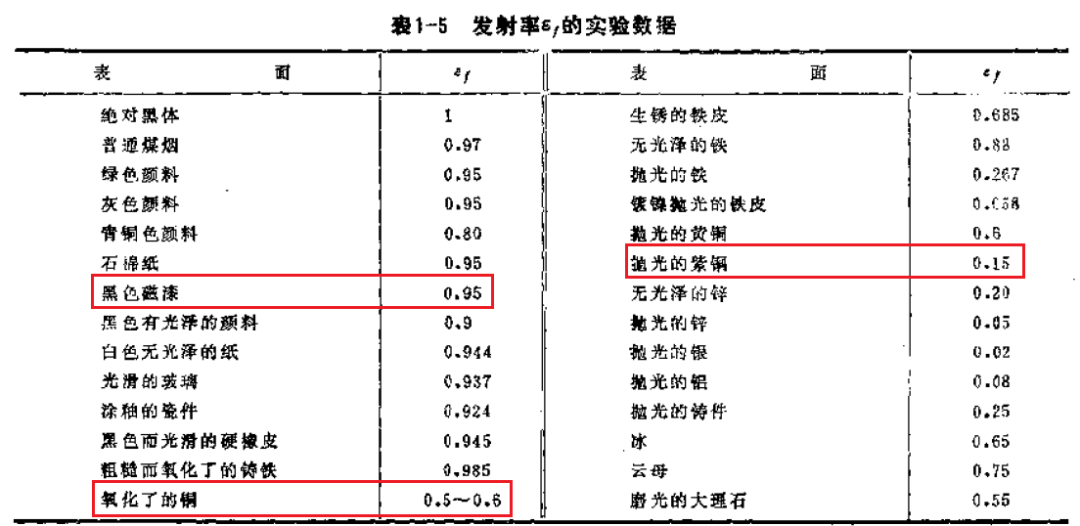 經驗數(shù)據(jù)表明,黑色磁漆的發(fā)散率為0.95,氧化了的銅的發(fā)散率為0.5~0.6,拋光的紫銅發(fā)散率為0.15,見下表1-5。