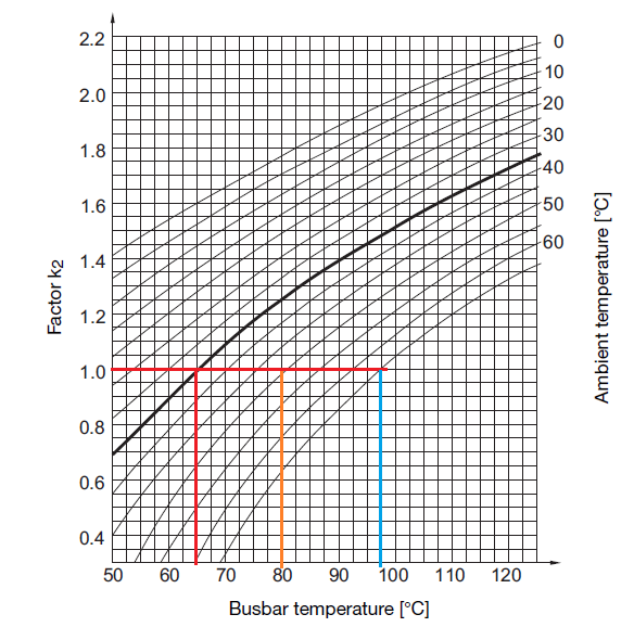 我們以DIN43671-1975中的K2系數(shù)表為例,在系數(shù)為1的位置做一條水平線,你會發(fā)現(xiàn)只要環(huán)境溫度與母排溫度差值等于30K,銅排的載流量就和環(huán)溫35℃、母排溫度65℃的載流量相等,即此時銅排載流只與銅排溫升相關。