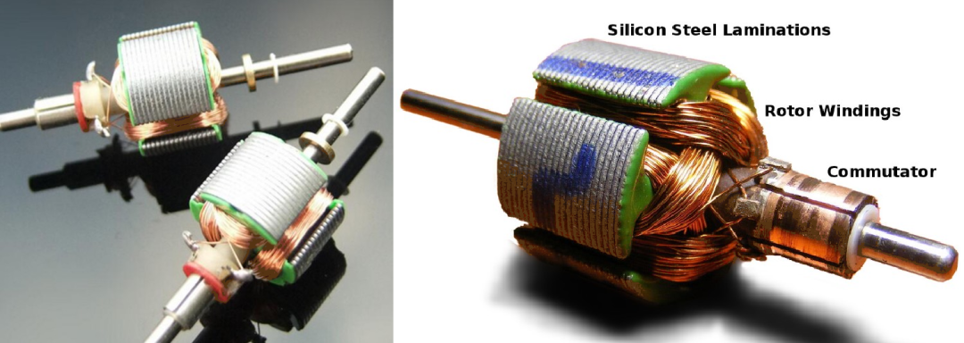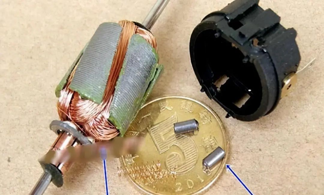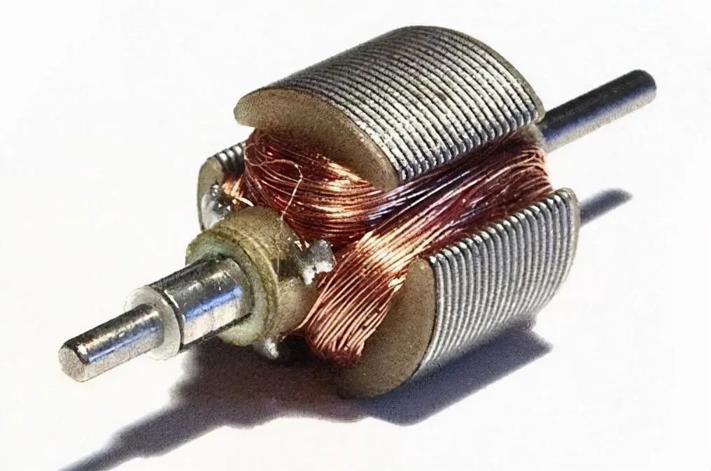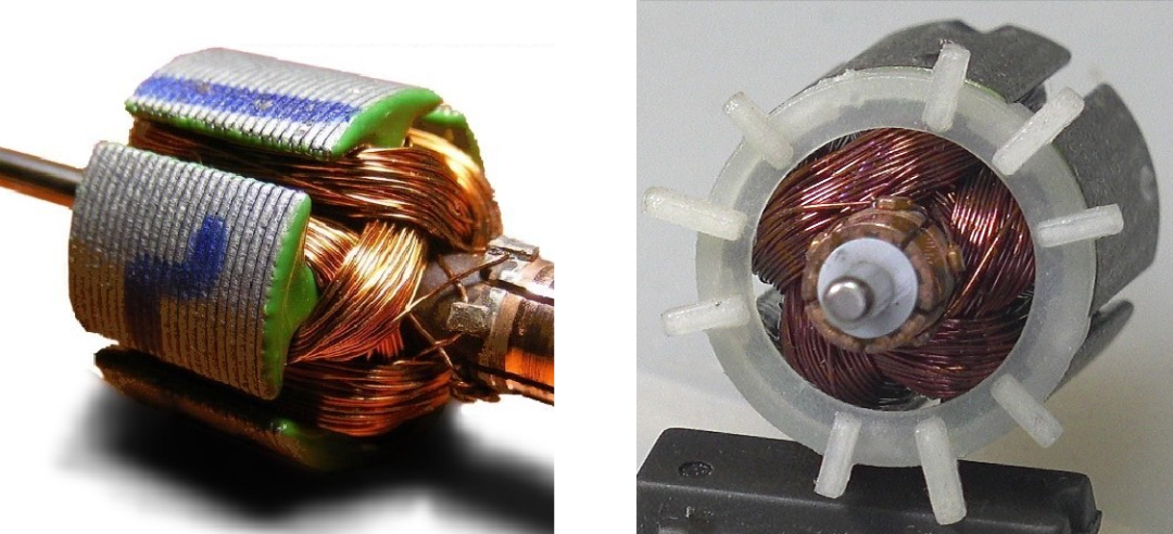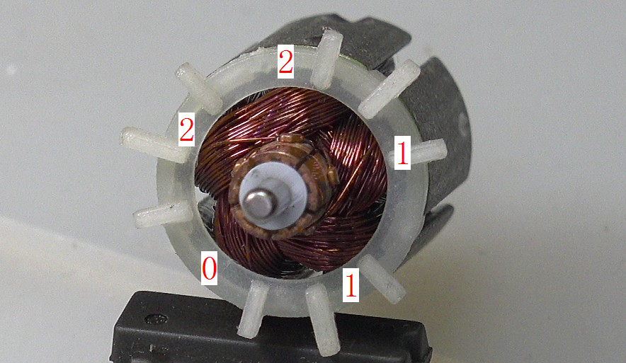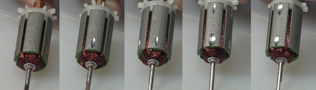 我們可以從網(wǎng)絡(luò)上看到各種電機(jī)轉(zhuǎn)子,奇怪的是它們表面所呈現(xiàn)的都是完整的,沒有凹槽。此時需要對手邊表面帶有凹槽的轉(zhuǎn)子進(jìn)行仔細(xì)觀察,可以看到轉(zhuǎn)子上的五個線圈繞制并不是對稱的,這與線圈被繞制的順序有關(guān)系。