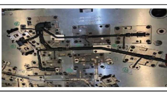 解決措施:線束加工過程中,管線要擺放平整,無扭轉(zhuǎn)的安裝在注塑模具上,然后才能注塑加工,如圖3所示。或者模具設(shè)計(jì)不合理,需要重新設(shè)計(jì)驗(yàn)證模具,調(diào)整合適的注塑件角度。