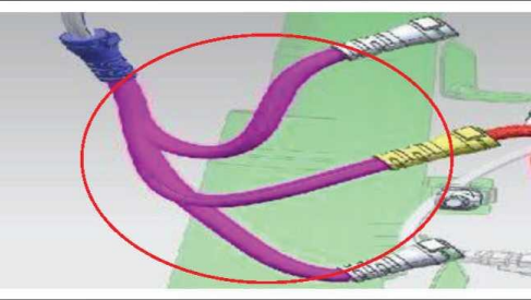 輪線束運(yùn)動區(qū)域尺寸設(shè)計(jì)冗余小或彎曲半徑小,線束被彎折出現(xiàn)折痕。