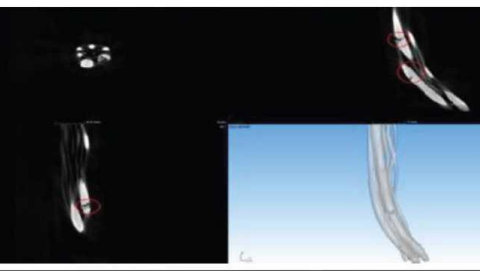 經(jīng)過仔細(xì)評估和試驗(yàn)驗(yàn)證,需要更改線束布局,否則折痕問題無法解決,并且輪跳試驗(yàn)壽命測試也無法滿足要求現(xiàn)有輪線束設(shè)計(jì)的運(yùn)動包絡(luò),如圖6所示,運(yùn)動彎折角度過大,輪跳試驗(yàn)無法通過測試,試驗(yàn)后 X光掃描和輪線束拆解斷絲情況,如圖7所示。