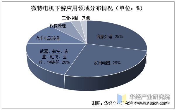 從微特電機的下游看,信息處理、家用電器和武器、航空等領(lǐng)域占據(jù)主要份額,市場份額占比分別為29%、26%、20%,其余應(yīng)用領(lǐng)域為汽車電器設(shè)備、視像處理、工業(yè)控制等。