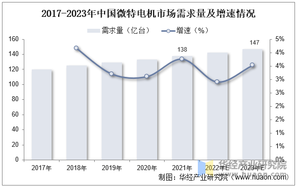 需求量方面,近年來保持逐年增長態(tài)勢,據(jù)統(tǒng)計,我國微特電機市場需求量從2017年的120億臺增長至2021年的138億臺,到2023年將達147億臺。
