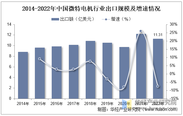 國產(chǎn)微特電機成本低、質(zhì)量高的優(yōu)勢推動我國成為微特電機出口大國。近年來,受國際市場經(jīng)濟放緩影響,加之歐美發(fā)達國家通過頒布技術(shù)法規(guī)、推行技術(shù)標(biāo)準(zhǔn)、實施認(rèn)證制度構(gòu)建技術(shù)性貿(mào)易壁壘,對我國微特電機出口造成一定不利影響,出口規(guī)模從2019開始有所下滑,但仍保持較高水平,數(shù)據(jù)顯示,我國2022年出口規(guī)模達11.31億美元,同比下降7.60%。