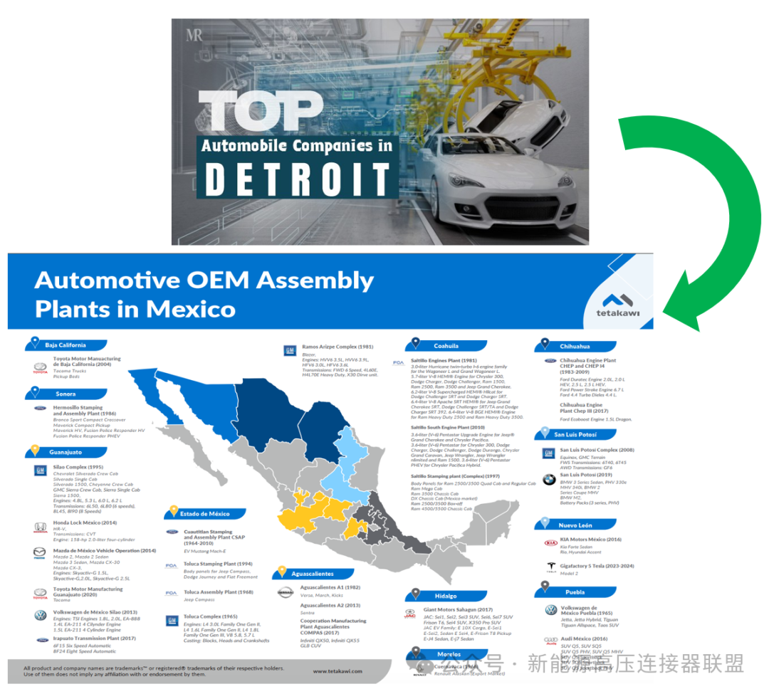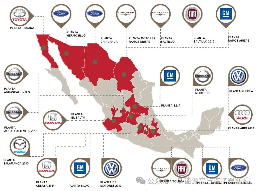 墨西哥目前擁有26家以上的汽車工廠,這其中包括通用汽車、福特、日產(chǎn)、Stellantis、大眾和現(xiàn)代汽車等,同時墨西哥汽車工業(yè)擁有 100 多萬個工作崗位和 300 個研發(fā)中心,生產(chǎn) 50 多個品牌和 500 多個車型,擁有極其完整的汽車產(chǎn)業(yè)制造線。