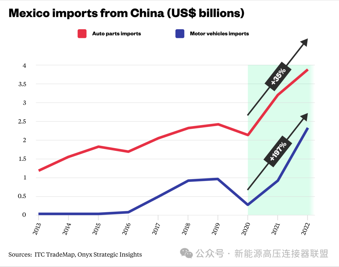 也因為此,從2020年到2022年,墨西哥對中國汽車零部件的進口增長了30%以上,為中國在墨西哥的生產(chǎn)提供了支持,而汽車進口量幾乎翻了一番,為墨西哥提供了中國汽車制造商的終端市場。