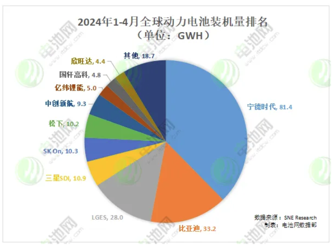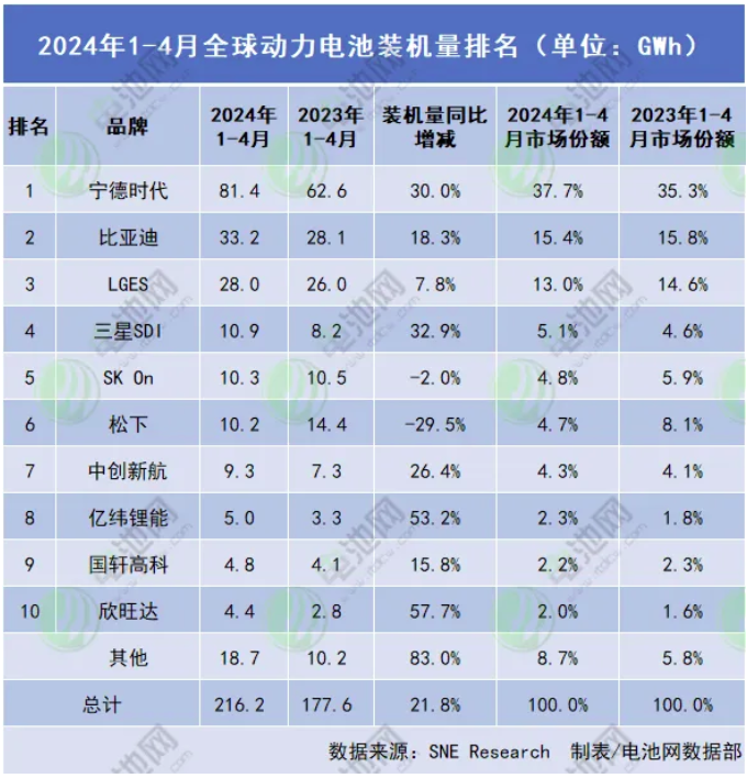 1-4月全球動(dòng)力電池裝車量TOP10公司中,韓系三大電池公司市場(chǎng)份額為22.8%,較去年同期下降2.4個(gè)百分點(diǎn)。