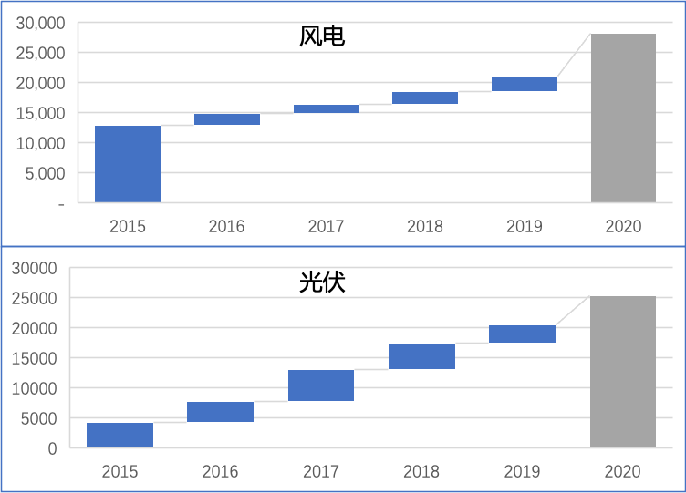圖2我國(guó)風(fēng)電光伏歷年新增及累計(jì)裝機(jī)(萬(wàn)千瓦)