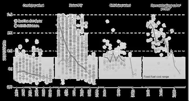 圖3IRENA統(tǒng)計(jì)歷年全球平均風(fēng)電光伏LCOE趨勢(shì)