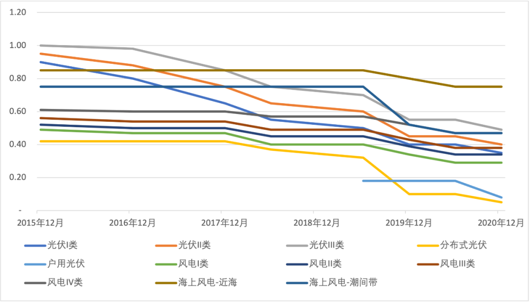 圖4我國(guó)歷年風(fēng)電光伏標(biāo)桿電價(jià)(元/kwh)