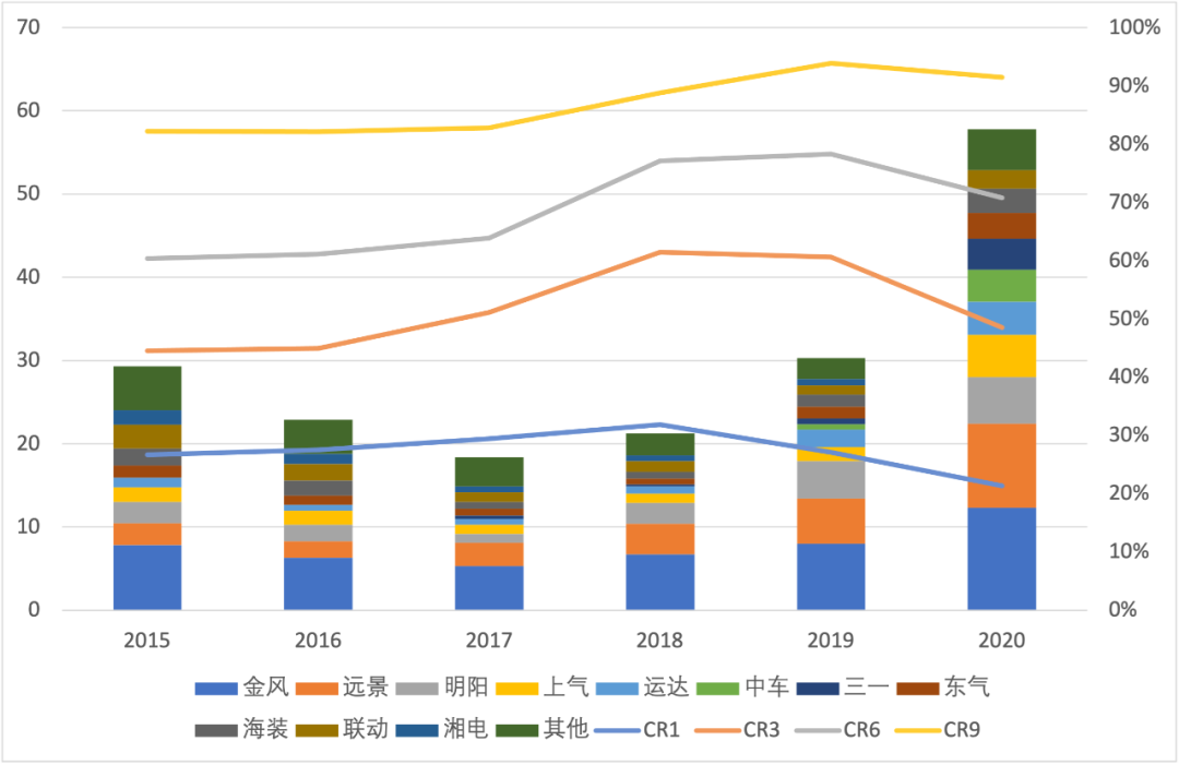 圖6歷年國(guó)內(nèi)風(fēng)機(jī)新增量份額及集中度(彭博新能源財(cái)經(jīng))