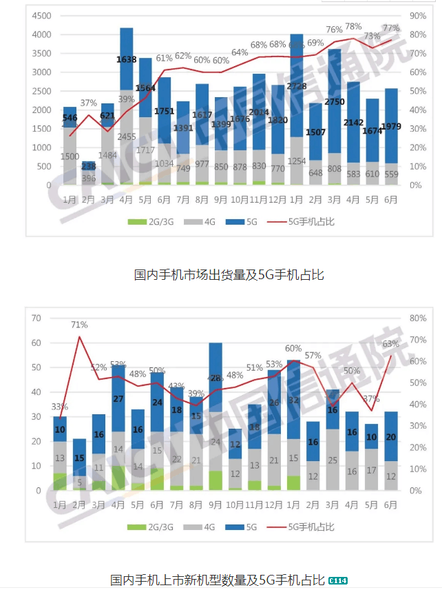 2021年6月,國(guó)內(nèi)市場(chǎng)手機(jī)出貨量2566.4萬(wàn)部,同比下降10.4%,環(huán)比增長(zhǎng)11.7%,其中5G手機(jī)1979.1萬(wàn)部,同比增長(zhǎng)13.0%,環(huán)比增長(zhǎng)18.2%,占同期手機(jī)出貨量的77.1%。