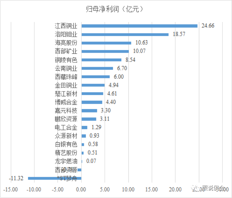 凈利潤方面,江西銅業(yè)歸屬母公司凈利潤為24.66億元,位列銅行業(yè)19家上市公司凈利潤榜單第一。西部資源和*ST夢舟兩家公司出現(xiàn)虧損,*ST夢舟虧損金額高達(dá)11.32億元。