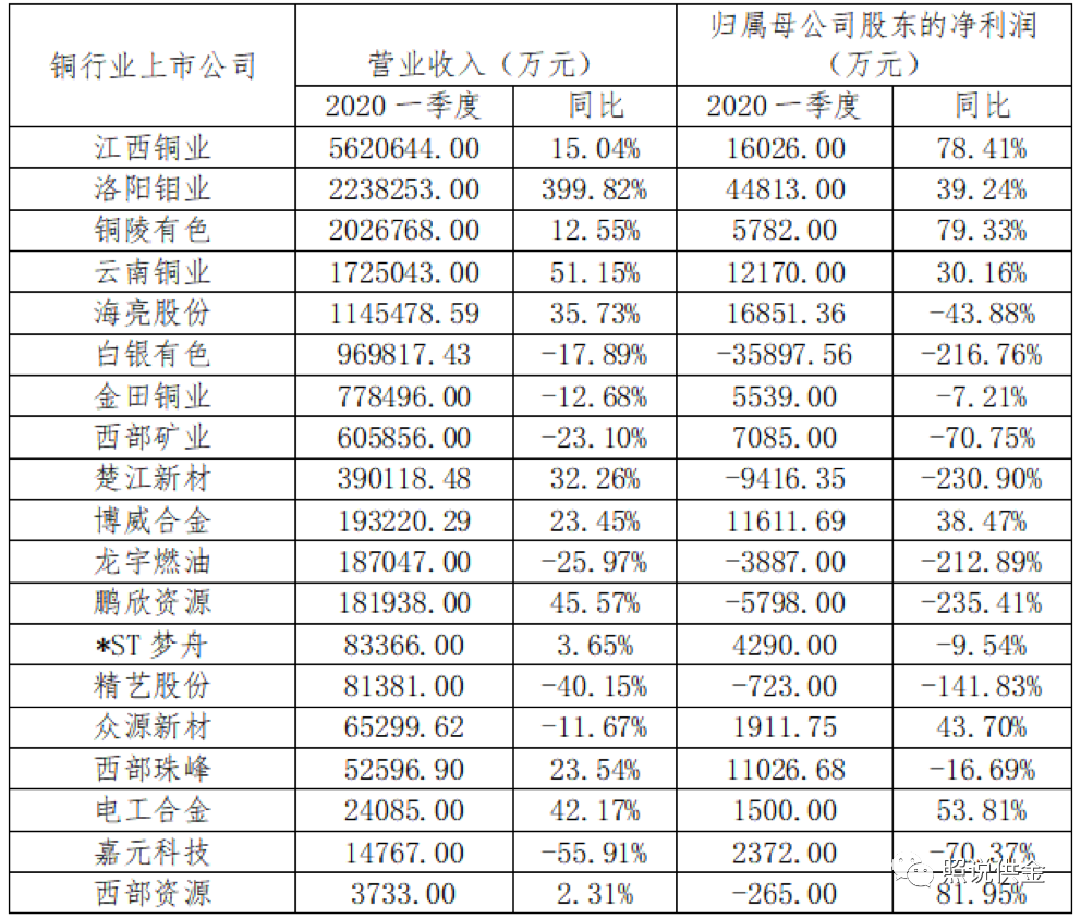 2020年初新冠疫情對銅行業(yè)企業(yè)的生產(chǎn)經(jīng)營產(chǎn)生造成了一定影響,銅金屬價格跌幅較大,近半銅行業(yè)上市公司一季度營業(yè)收入和凈利潤較上年同期有所下降。
