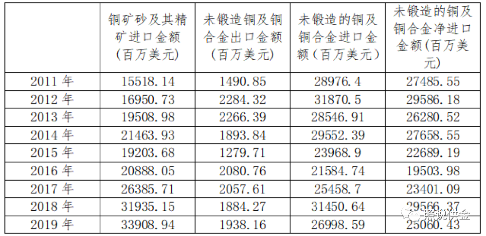 表2 2011-2019年銅礦砂及其精礦、未鍛造銅及銅合金進(jìn)出口情況統(tǒng)計(jì)