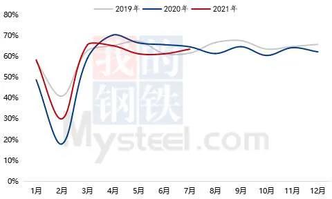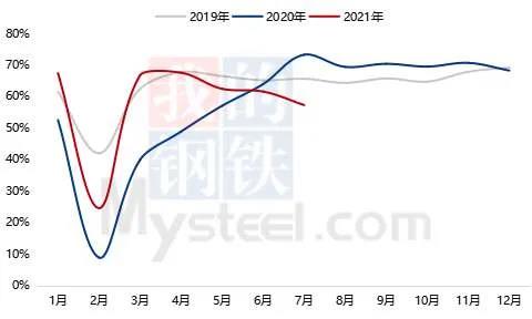 圖7:2019-2021年中國再生銅制桿企業(yè)產(chǎn)能利用率