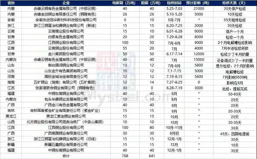 表1:2021年中國冶煉企業(yè)檢修統(tǒng)計(jì)表