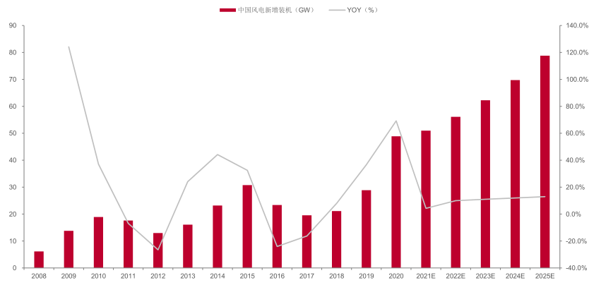 2008-2025年中國風(fēng)電歷史新增裝機(jī)及預(yù)測(GW) 數(shù)據(jù)來源:CWEA、中泰證券研究所