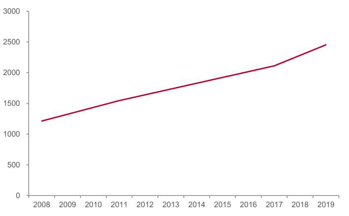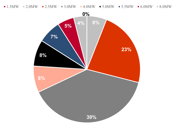 歷年國內(nèi)風(fēng)電新增裝機(jī)單機(jī)功率(KW) 來源:CWEA、國際能源網(wǎng)、中泰證券研究所
