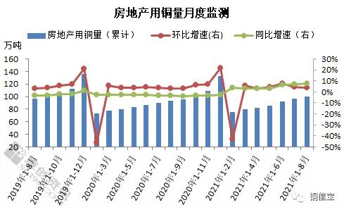 根據(jù)卓創(chuàng)資訊監(jiān)測(cè)的數(shù)據(jù)顯示,2021年1-8月房地產(chǎn)行業(yè)用銅量約為99.92萬(wàn)噸,同比增長(zhǎng)7.55%。