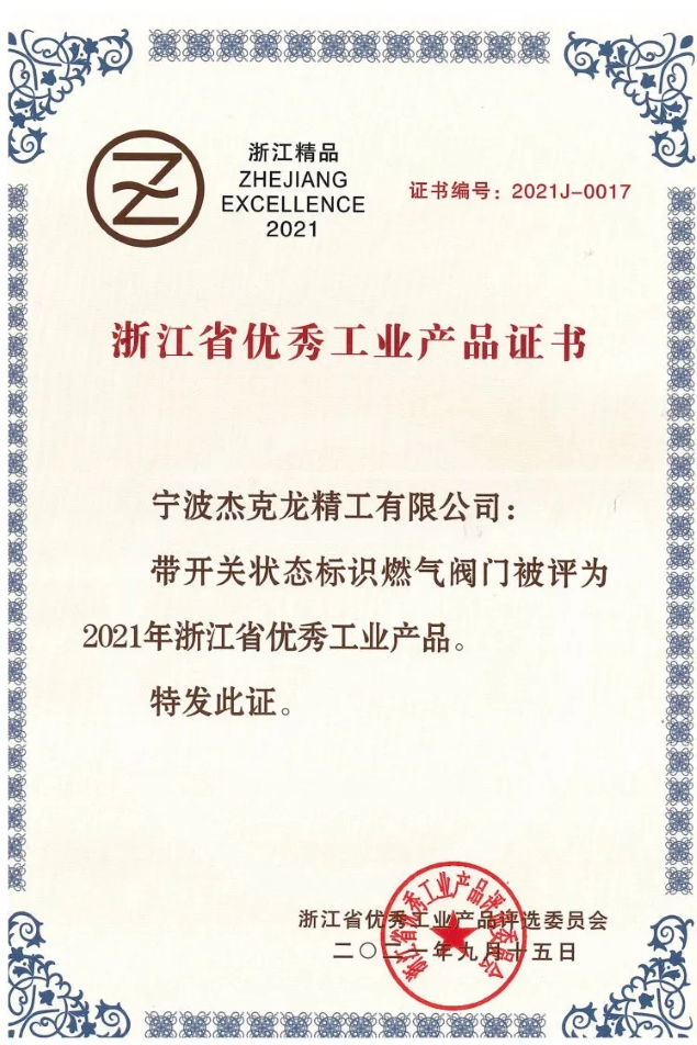 近日,浙江省優(yōu)秀工業(yè)產(chǎn)品評(píng)選委員會(huì)公布了“2021年浙江省優(yōu)秀工業(yè)產(chǎn)品”評(píng)選結(jié)果,杰克龍精工公司自主研發(fā)設(shè)計(jì)的“帶開(kāi)關(guān)狀態(tài)標(biāo)識(shí)燃?xì)忾y門(mén)”獲此殊榮。