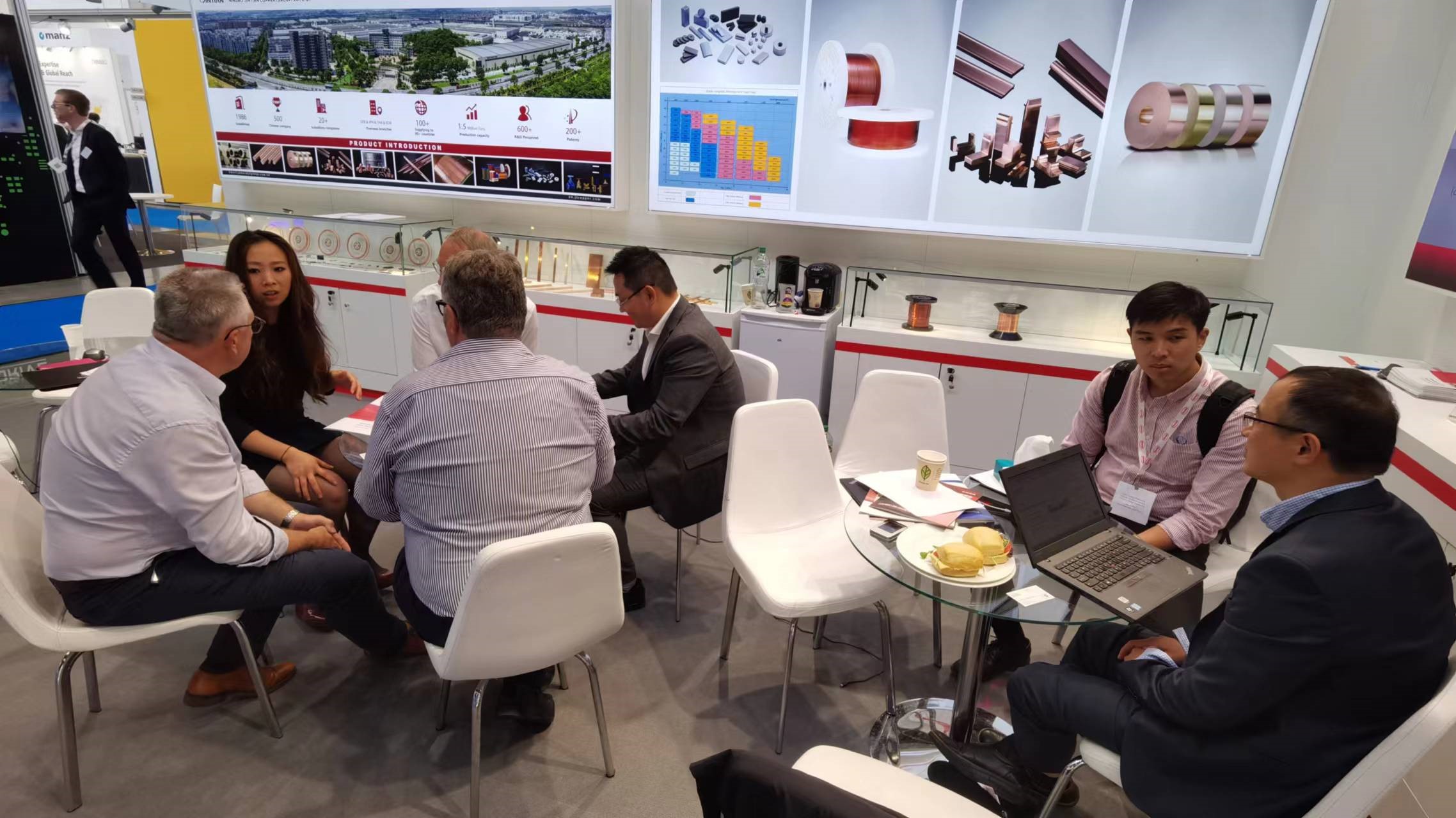 兩場(chǎng)展會(huì)上,集團(tuán)德國(guó)辦攜新能源汽車領(lǐng)域用高精密銅合金帶材、棒線、銅排、銅線,以及高性能稀土永磁材料、電磁線,以及暖通制冷領(lǐng)域用高精密銅管、管件、閥門等系列產(chǎn)品,吸引了眾多客戶駐足交流。
