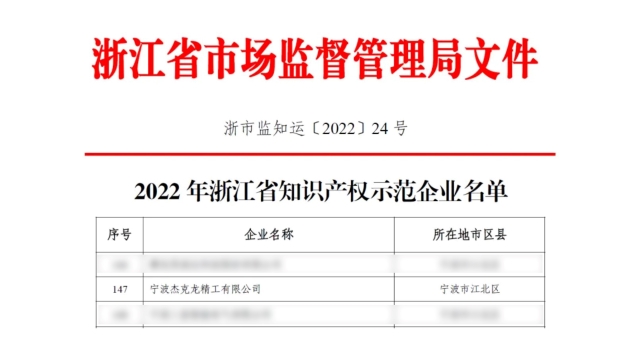 9月8日,浙江省市場監(jiān)督管理局公布了《2022年浙江省知識產(chǎn)權(quán)示范企業(yè)名單》,寧波杰克龍精工有限公司成功入選。