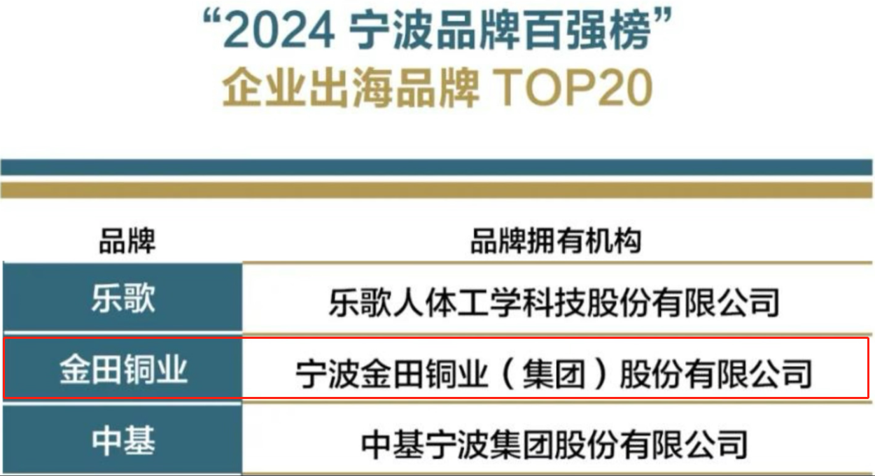 榮譽(yù) | 金田銅業(yè)入圍“2024寧波品牌百強(qiáng)榜”