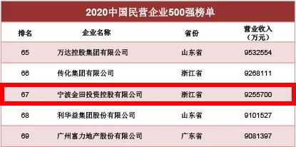 2020中國民企500強(qiáng)榜單發(fā)布!金田投資位列第67位,較去年上升8位!