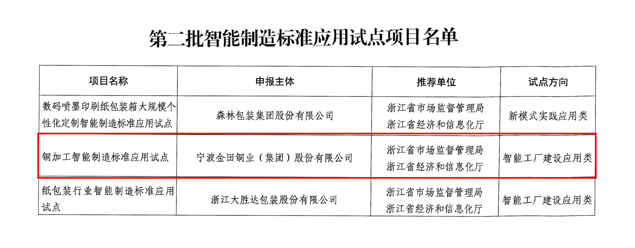 近日,國(guó)家標(biāo)準(zhǔn)化管理委員會(huì)、工業(yè)和信息化部公布了國(guó)家第二批智能制造標(biāo)準(zhǔn)應(yīng)用試點(diǎn)名單。此次全國(guó)共有76個(gè)項(xiàng)目入選,金田銅業(yè)申報(bào)的“銅加工智能制造標(biāo)準(zhǔn)應(yīng)用試點(diǎn)”項(xiàng)目系有色金屬銅加工行業(yè)唯一入選項(xiàng)目,標(biāo)志著金田銅業(yè)智能制造標(biāo)準(zhǔn)化建設(shè)取得重大突破。