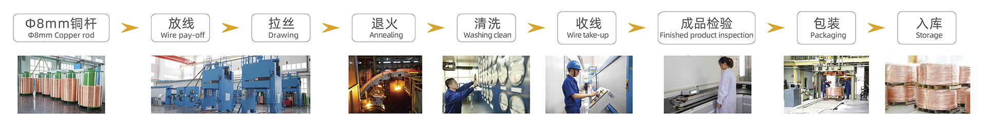 Φ8mm銅桿 → 放線 → 拉絲 → 退火 → 清洗 → 收線 → 成品檢驗 → 包裝 → 入庫