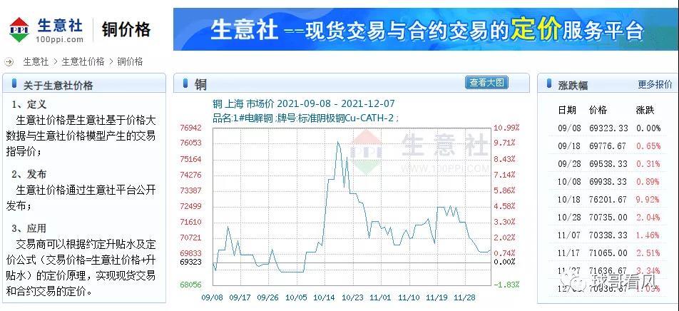 北極星風(fēng)力發(fā)電網(wǎng)訊:時(shí)間鎖定在12月7日,當(dāng)日銅的價(jià)格再次鎖定在70010元/噸(最低價(jià)格69610元/噸),而在一年前,其價(jià)格是45000元/噸左右,同比漲價(jià)幅度高達(dá)55.6%,過去3個(gè)月以來,銅的價(jià)格一直在飄紅,從69223元/噸漲價(jià)就未停止,在當(dāng)前部分地區(qū)限電的形勢下,銅價(jià)似乎沒有停下來的跡象。