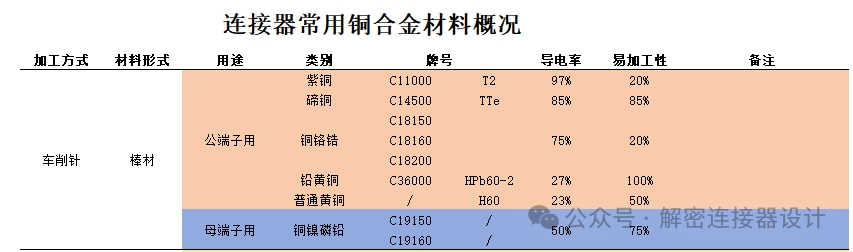? ? 連接器用銅合金牌號眾多,下面就連接器常用的銅合金牌號,按加工方式進行整理如下,方便大家按加工方式、導(dǎo)電率進行初步設(shè)計選擇。